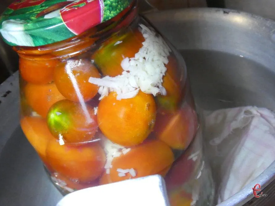 - Приготуйте маринад та доведіть його до кипіння. Гарячим маринадом залийте банки з помідорами та стерилізуйте їх у киплячій воді 10 хвилин.