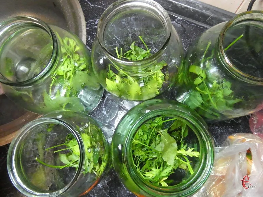 - Заздалегідь простерилізуйте банки для помідорів. На дно викладіть петрушку, листя смородини та вишень.