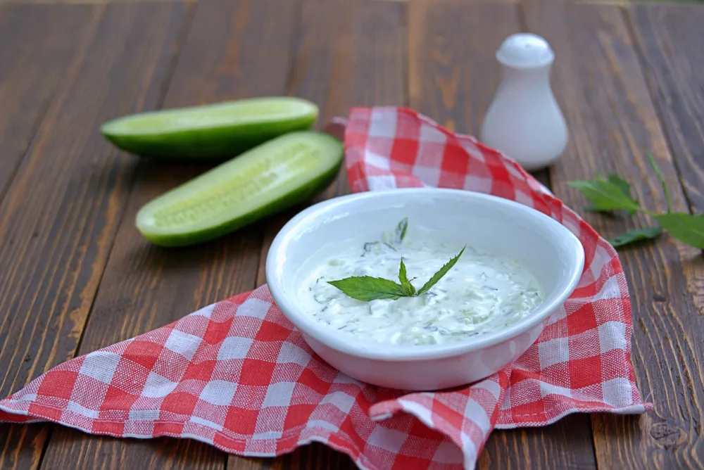 У мисці з'єднуємо грецький йогурт з огірками, додаємо сіль та перець до смаку. Присмачуємо подрібненим на дрібній терці часником і ретельно все перемішуємо.