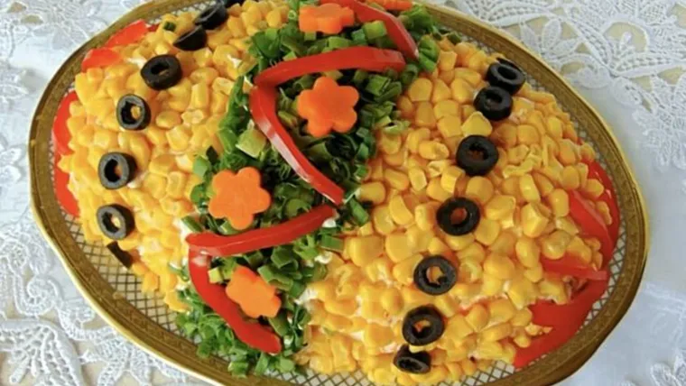 - Верхній шар сформуйте з консервованої кукурудзи.