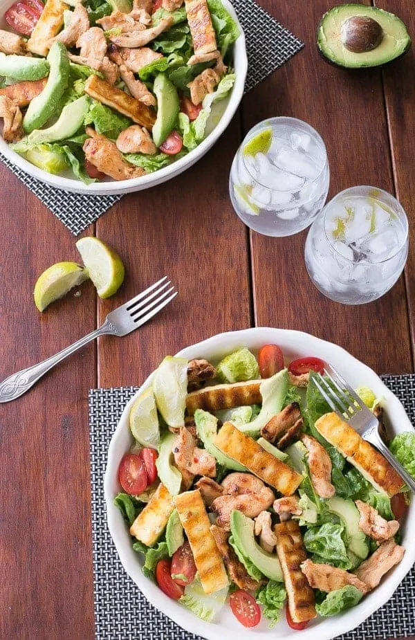 - Выложите в глубокое блюдо листья салата, курицу и халлуми, на них –ломтики помидора и авокадо. Полейте салат заправкой.