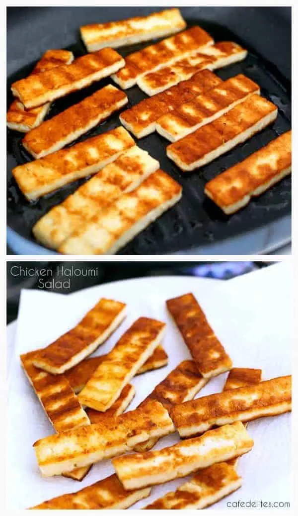 - Нарежьте халлуми длинными брусочками и обжарьте в другой сковороде до золотистого цвета (по 2 минуты с каждой стороны).