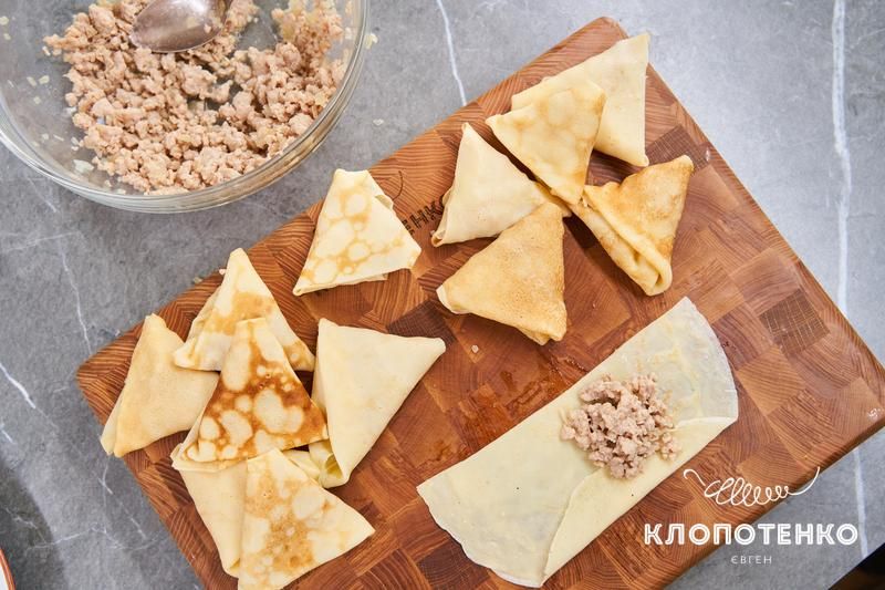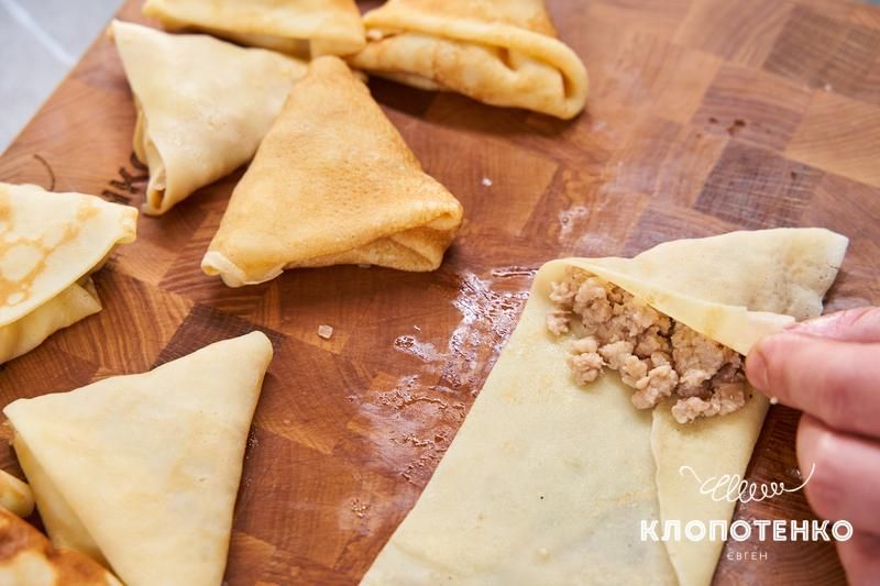 Чтобы сформировать бендерики, возьмите блинчик и разрежьте его пополам. Заверните закругленный край половинки блина внутрь таким образом, чтобы у вас получился аккуратный прямоугольник. Выложите столовую ложку начинки поближе к краю прямоугольника.