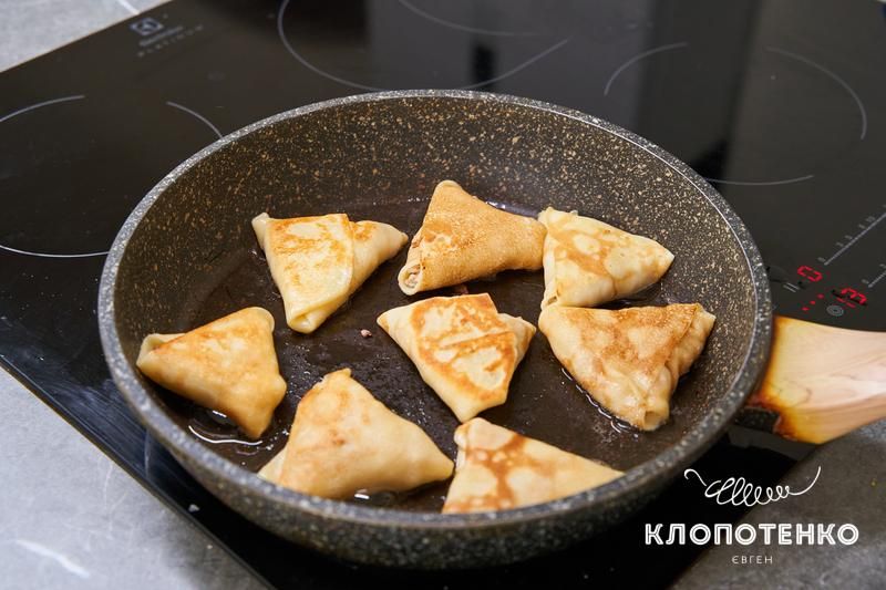 Формировать бендерики лучше всего из больших блинов. Поэтому для жарки следует выбрать сковороду диаметром более 22 сантиметров.