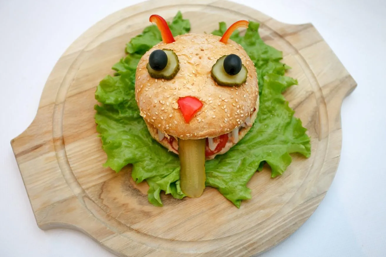 - Накройте котлету ломтиком сыра, кольцами томата и закройте верхушкой булочки. Приятного аппетита!