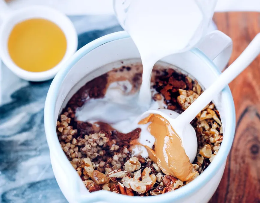 - К крупам добавьте растительное молоко, какао, орехи и финики.