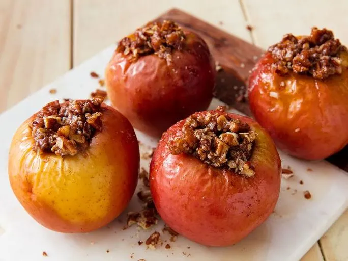 - Поджариваем грецкие орехи на сухой сковороде несколько минут. Нарезаем их грубыми кусочками. Перемешиваем с медом и выкладываем в яблоки.