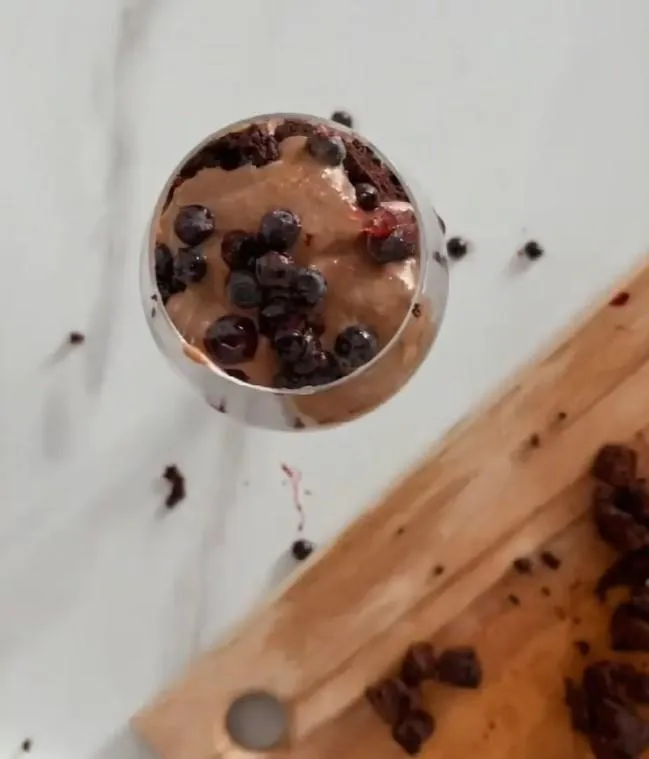 - В презентационный стакан выложите поочередно бисквит, крем, вишни. Чередуйте слои, пока не закончится место в стакане.