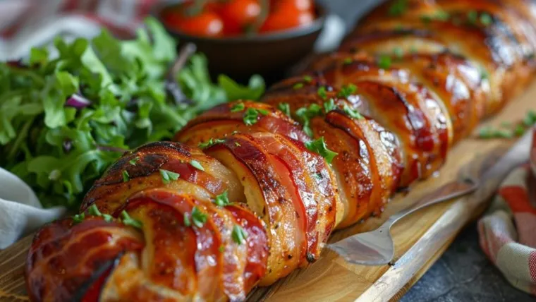- Выложите 3 полоски на длинную доску, а сверху на каждую – ленту из бекона. Закрепите один конец будущей косы кухонным шпагатом. Заплетите косу и закрепите кухонным шпагатом второй конец. Так же сделайте со вторыми тремя полосками.