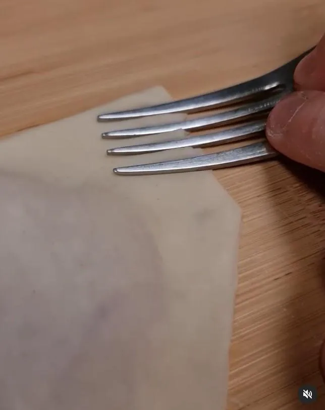 - Выложите в центр теста 1 – 2 столовые ложки фарша и сформируйте чебурек. Тщательно соедините края теста с помощью вилки.