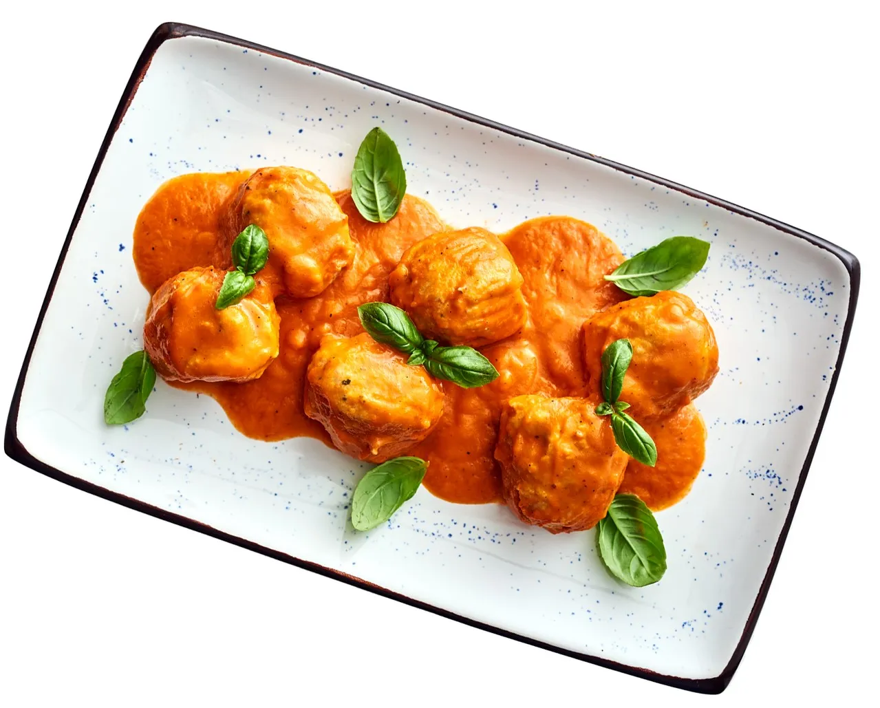 Не менее важным компонентом являются соусы. У LaStrava митболы на выбор – в классическом томатном соусе или в сливочном. Первый, в состав которого входят помидоры, карамелизированный лук и овощи, придает блюду характерную кислинку и пикантность. В то же время второй соус, приготовленный на основе бульона и сливок, делает вкус куриных митболов более изощренным. А какой из двух вариантов блюда дополнит ваш новогодний стол – выбор за вами!