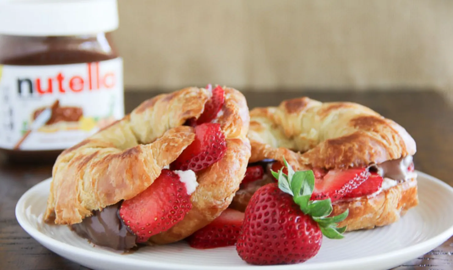 - Разрезаем круассаны пополам вдоль и смазываем их шоколадно-ореховой пастой.