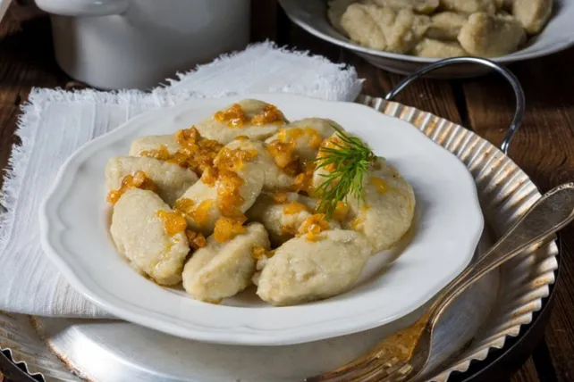 - Готовые кныдли полейте чесночным маслом, стряхните и посыпьте жареным луком.