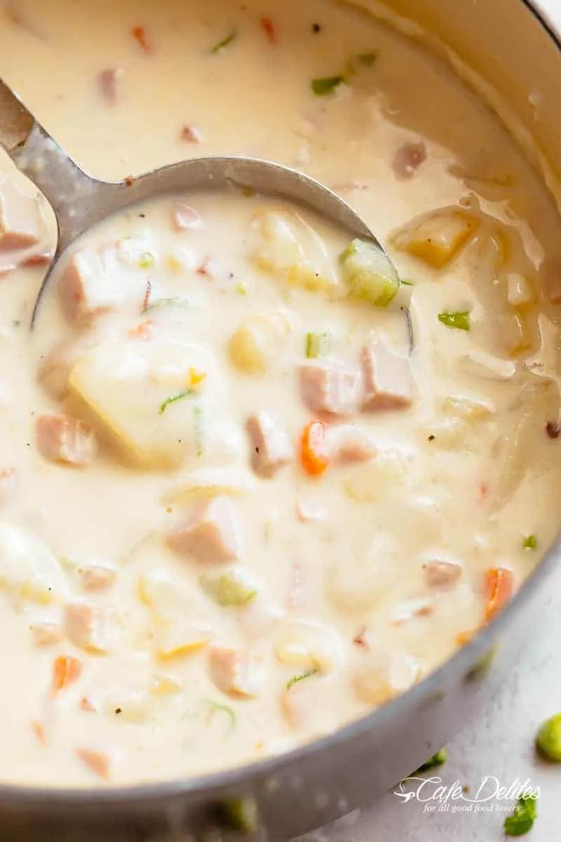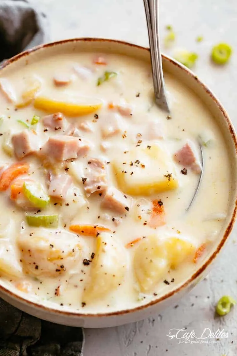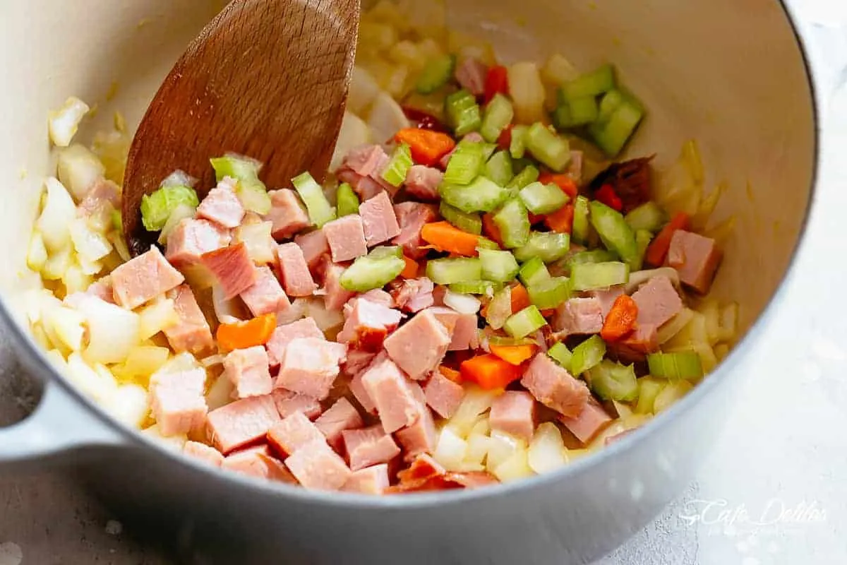 Добавьте нарезанные кубиками вареную ветчину и картофель.