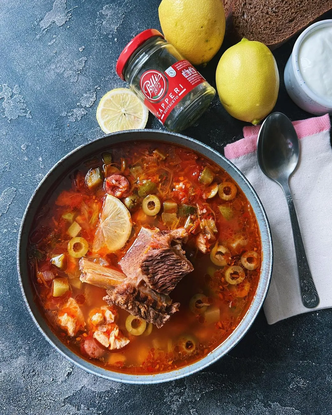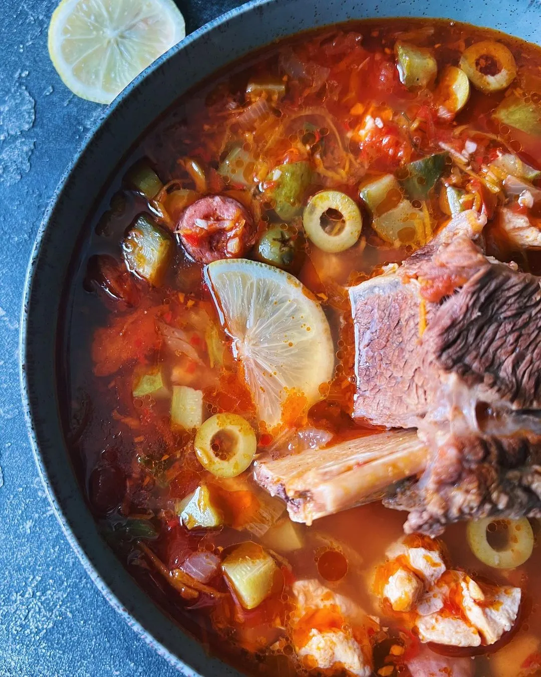 Солянка – это наваристый, сытный, густой суп с разнообразным мясом, оливками и лимоном. Также этот суп называют еще "похмельным", а все из-за его жирности.