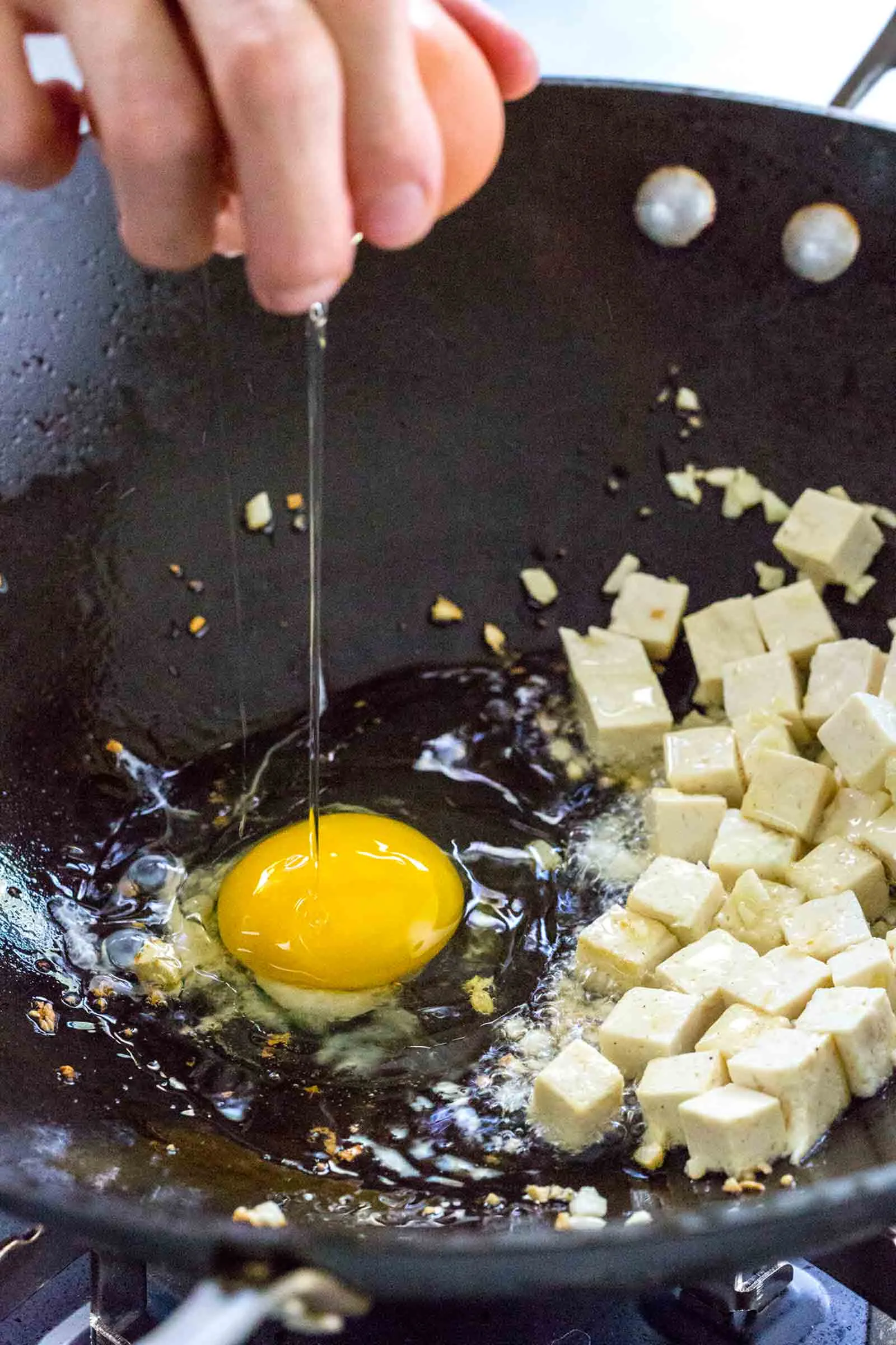 - Нарежьте средними кубиками тофу и обжарьте в течение 1 минуты. Отодвиньте тофу на крвй сковородки, добавьте яйцо и подержите его на огне несколько секунд.