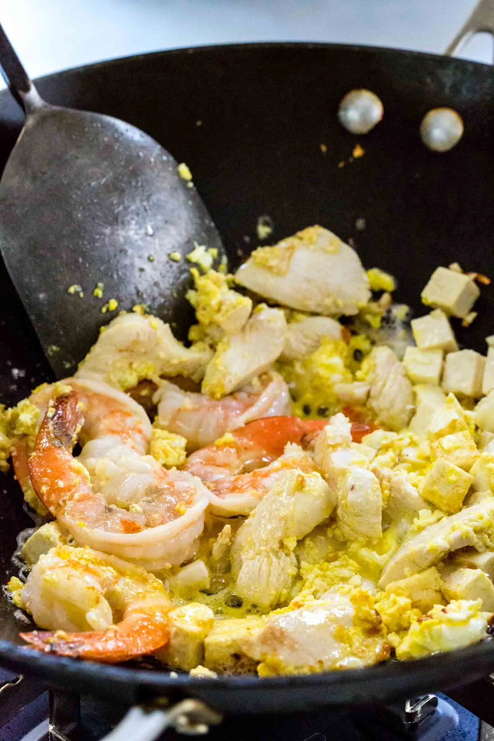 - Всыпьте в сковороду нарезанное полосками куриное филе и смешайте с жидким яйцом. Помешивайте ингредиенты примерно 2 минуты, затем добавьте креветки и готовьте, пока они не порозовеют.
