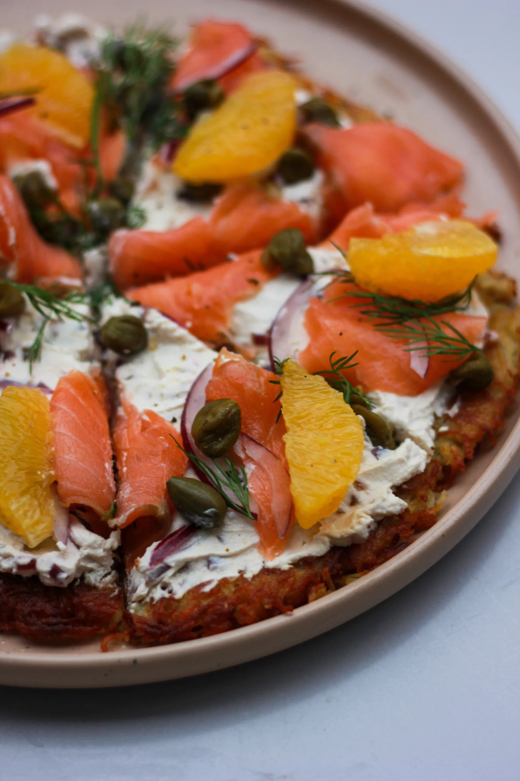 - Верх блинчика смазываем сырной массой, украшаем кусочками лосося, филе апельсина, нарезанным красным луком. Нарезаем как пиццу.
