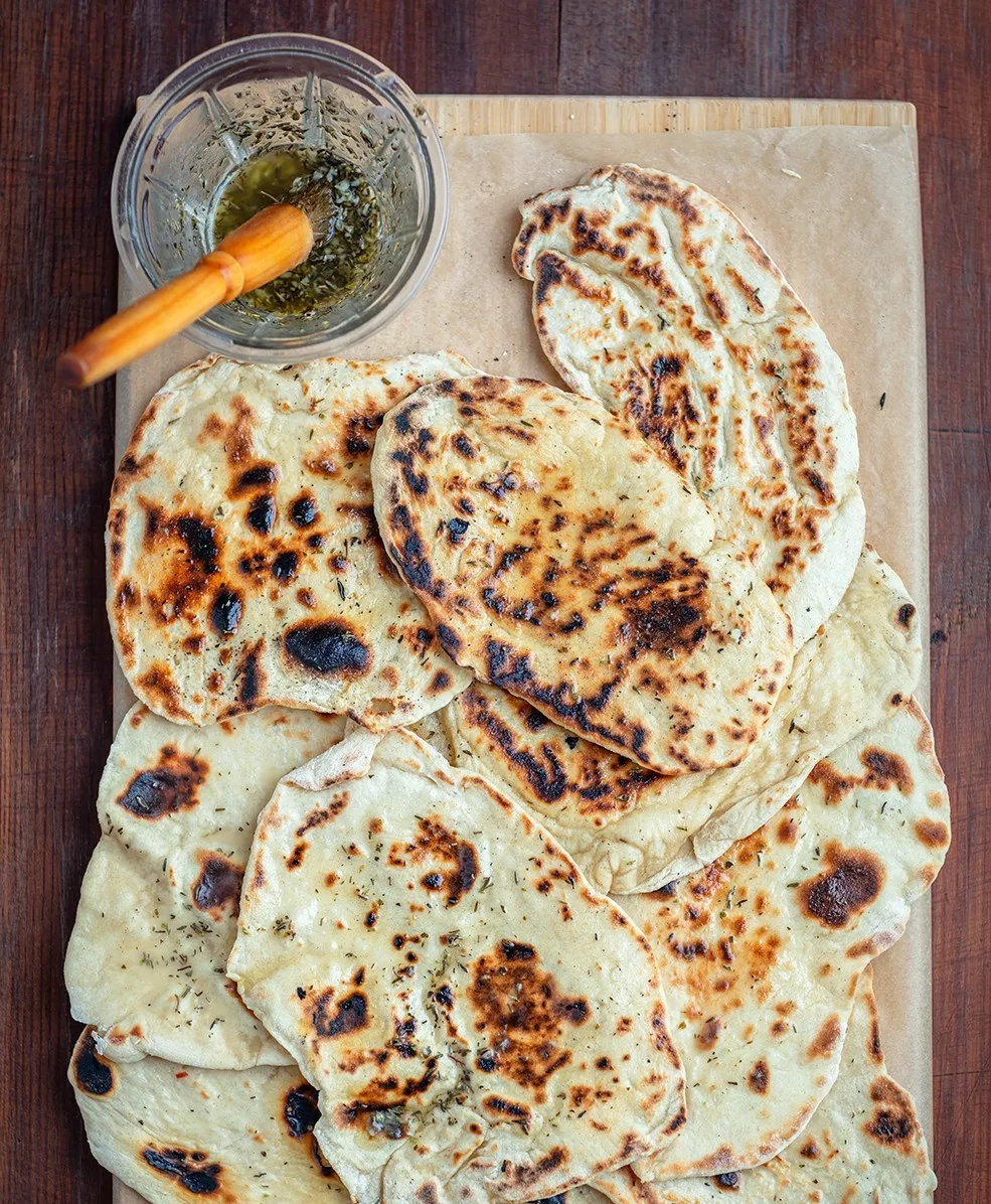 Наан – это мягкая и вкусная лепешка, основу которой составляет пресное пшеничное тесто. Такие хлебцы пригодятся для карри, хумуса и других паштетов.