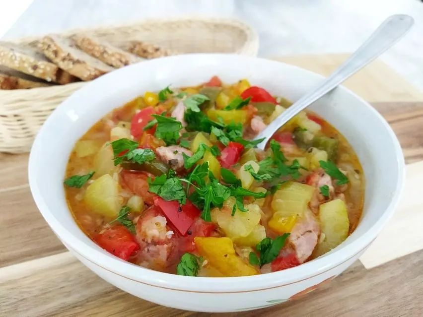 Легкое блюдо, насыщенное овощами и свежей зеленью, сэкономит ваше время и деньги. Попробуйте кабачки в сочетании с колбасой и перцем – и вы точно захотите повторить это снова.