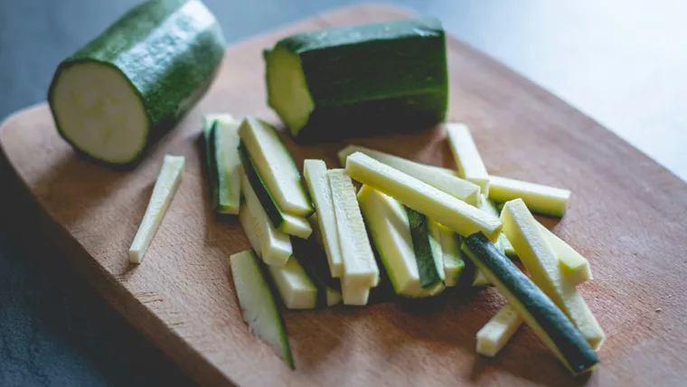 - Очищенные кабачки нарежьте на небольшие полоски.