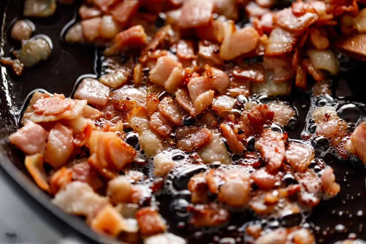 - Бекон нарежьте кубиками, обжарьте в большой сковороде на среднем огне до румяности и переложите шумовкой на блюдце.