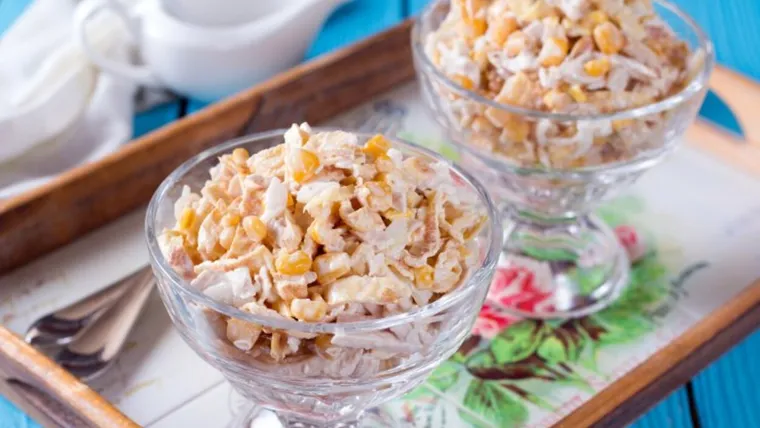 - Соедините все нарезанные ингредиенты в салатнике, добавьте консервированную кукурузу, немного соли и молотого черного перца. Заправьте майонезом и хорошо все перемешайте.