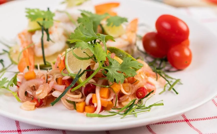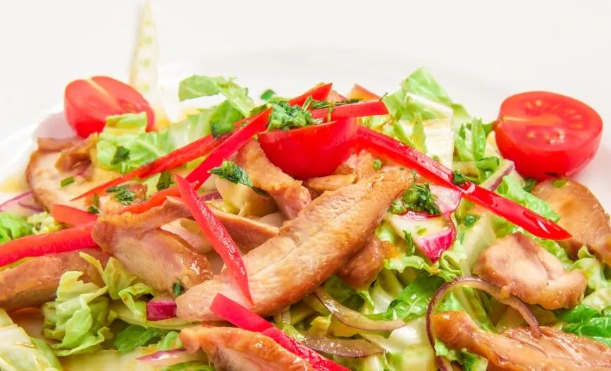 - В миску выложите мясо, листья салата сладкий перец, лук, чеснок, добавьте кориандр, щепотку красного сладкого перца, сбрызните соусом, перемешайте салат. Перед подачей задекорируйте измельченной петрушкой, помидорами. Приятного аппетита!