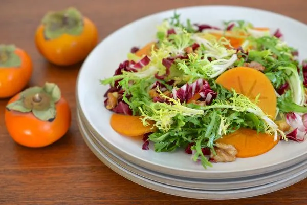 - Хурму нарежьте ломтиками, финики кусочками. Смешайте зелень с хурмой, финиками и грецкими орехами, заправьте соусом из лука и посыпьте льняным семенем. Приятного аппетита!