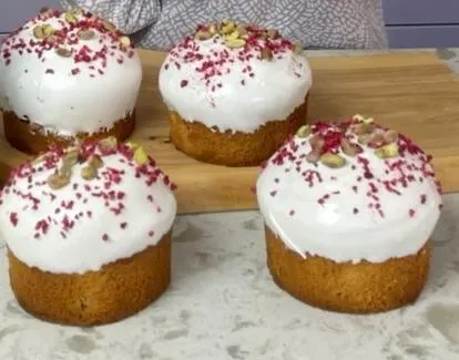 - Снимите форму с куличей, смажьте глазурью, задекорируйте фисташками и малиной. Оставьте до полного высыхания глазури. Приятного аппетита!