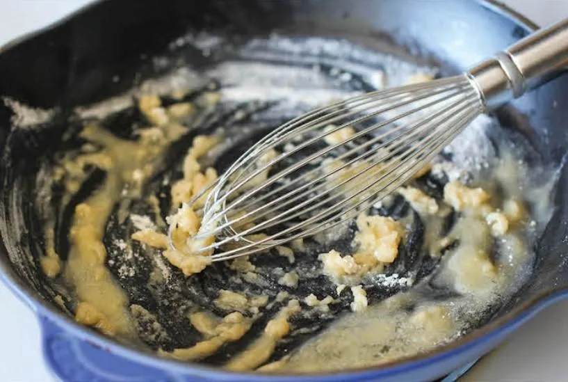 - Растопите в сковороде сливочное масло. Добавьте муку и обжарьте ее на среднем огне до легкой румяности.