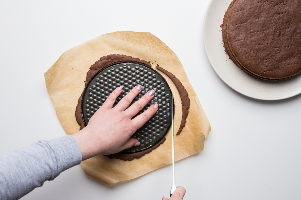- Каждую из частей раскатайте отдельно на пергаменте для выпечки, сделайте дырочки вилкой и испеките в разогретой до 170 градусов духовке около 5-7 минут.