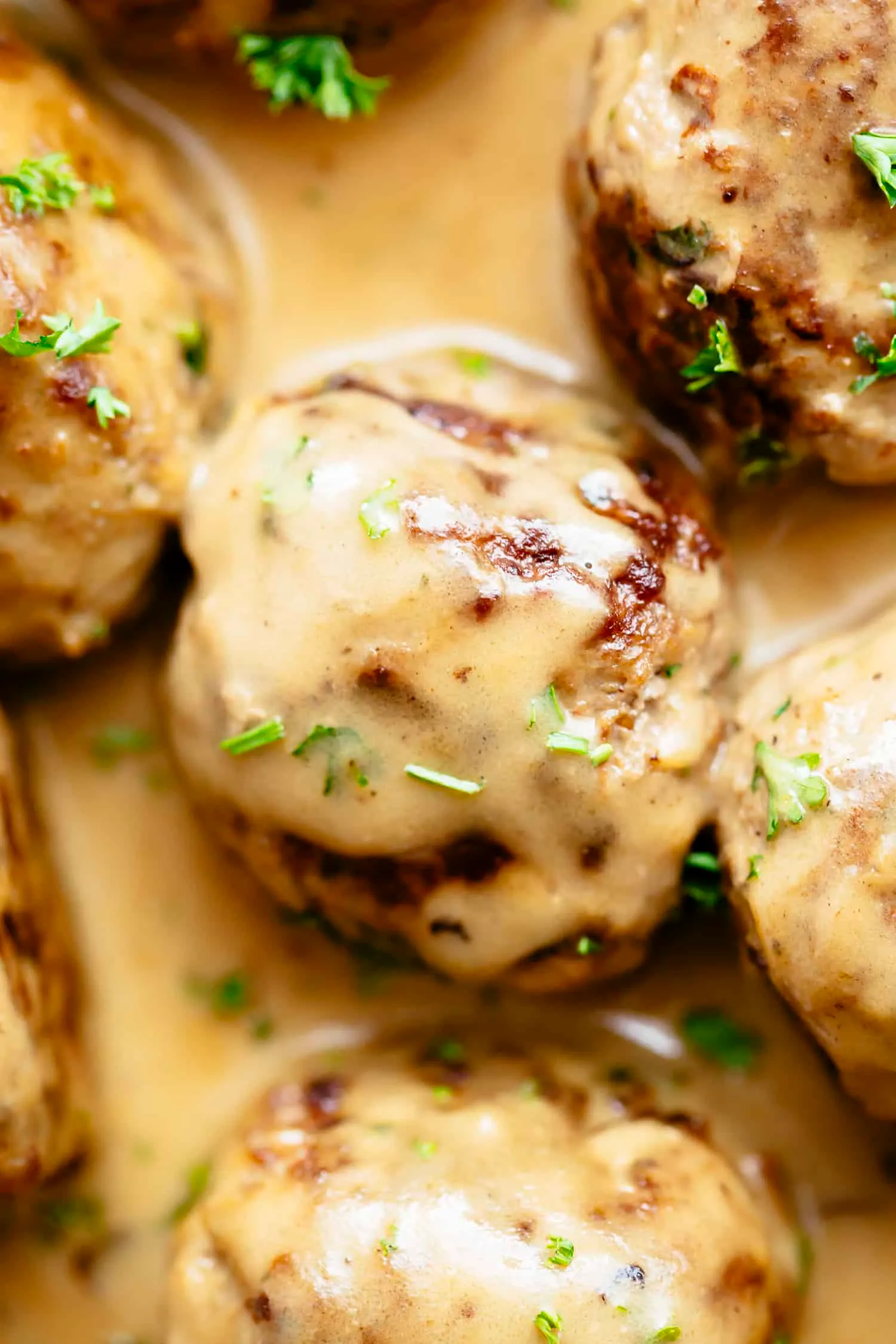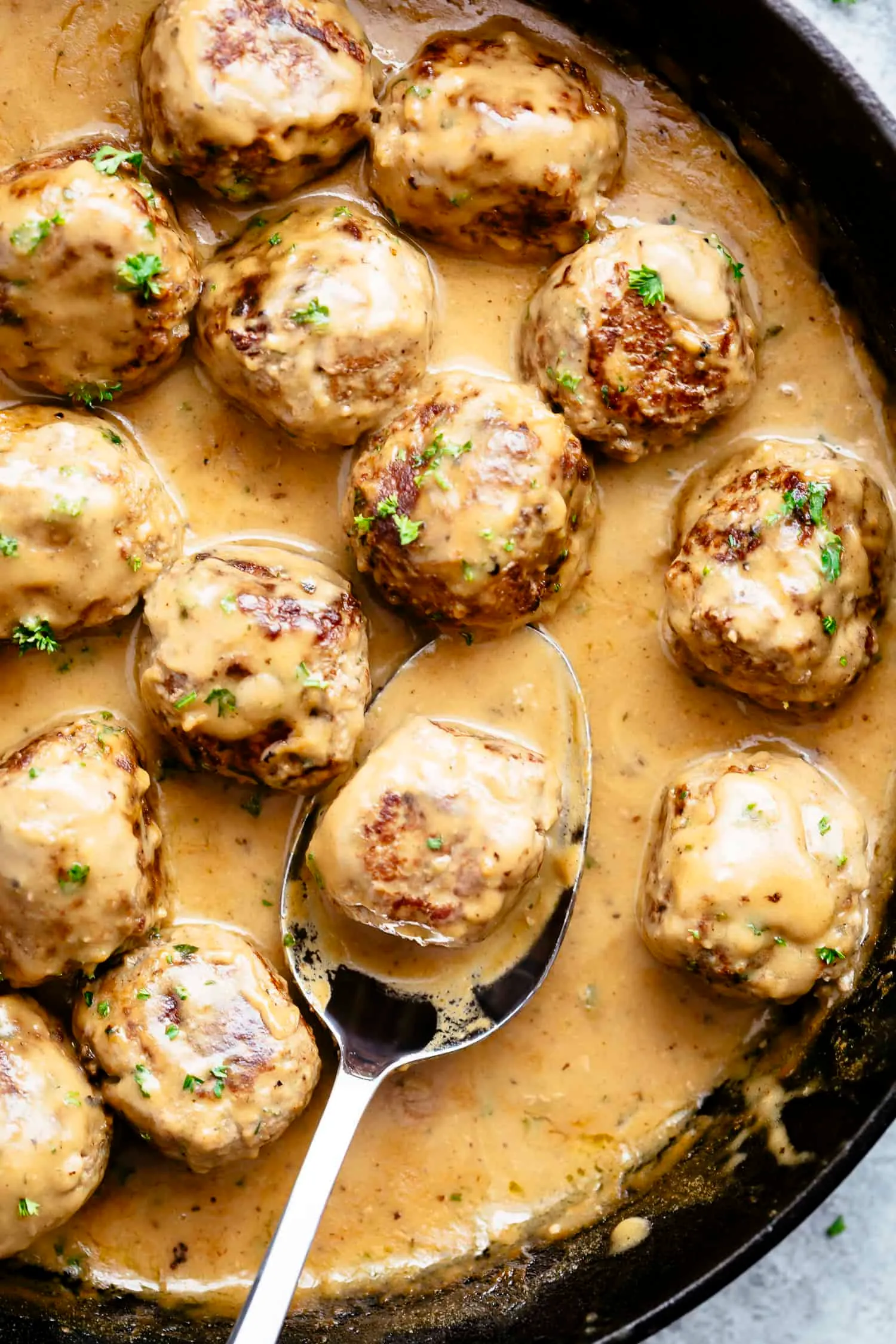 - Разогрейте в сковороде 1 столовую ложку сливочного масла и 2 чайные ложки растительного. Жарьте тефтели на среднем огне партиями, чтобы они не тушились, а жарились. Переложите обжаренные шарики на блюдо и накройте фольгой.