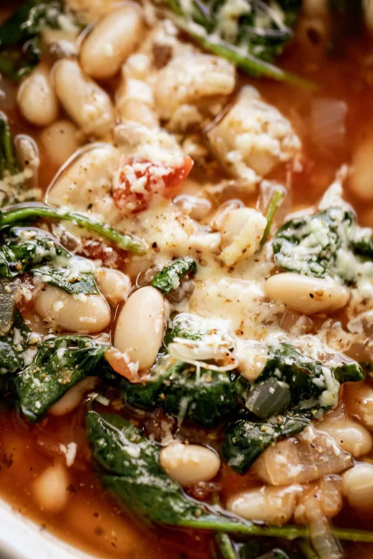 Добавьте фасоль и шпинат и тушите на медленном огне 2 минуты.