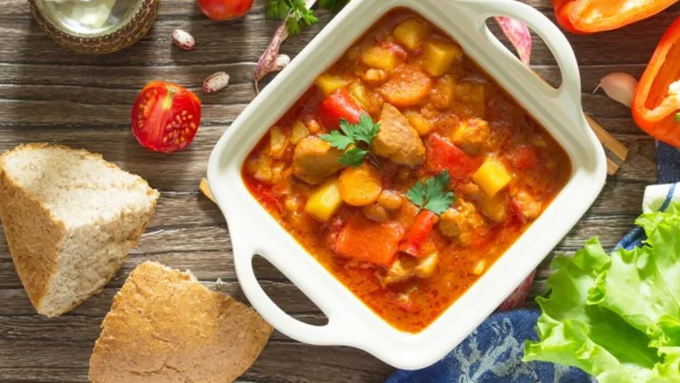 - Добавьте вареную фасоль, перемешайте и увеличьте огонь. Когда гуляш закипит, проварите его 1 – 2 минуты. Добавьте нарезанную зелень, накройте крышкой и оставьте настояться минимум на 10 минут.