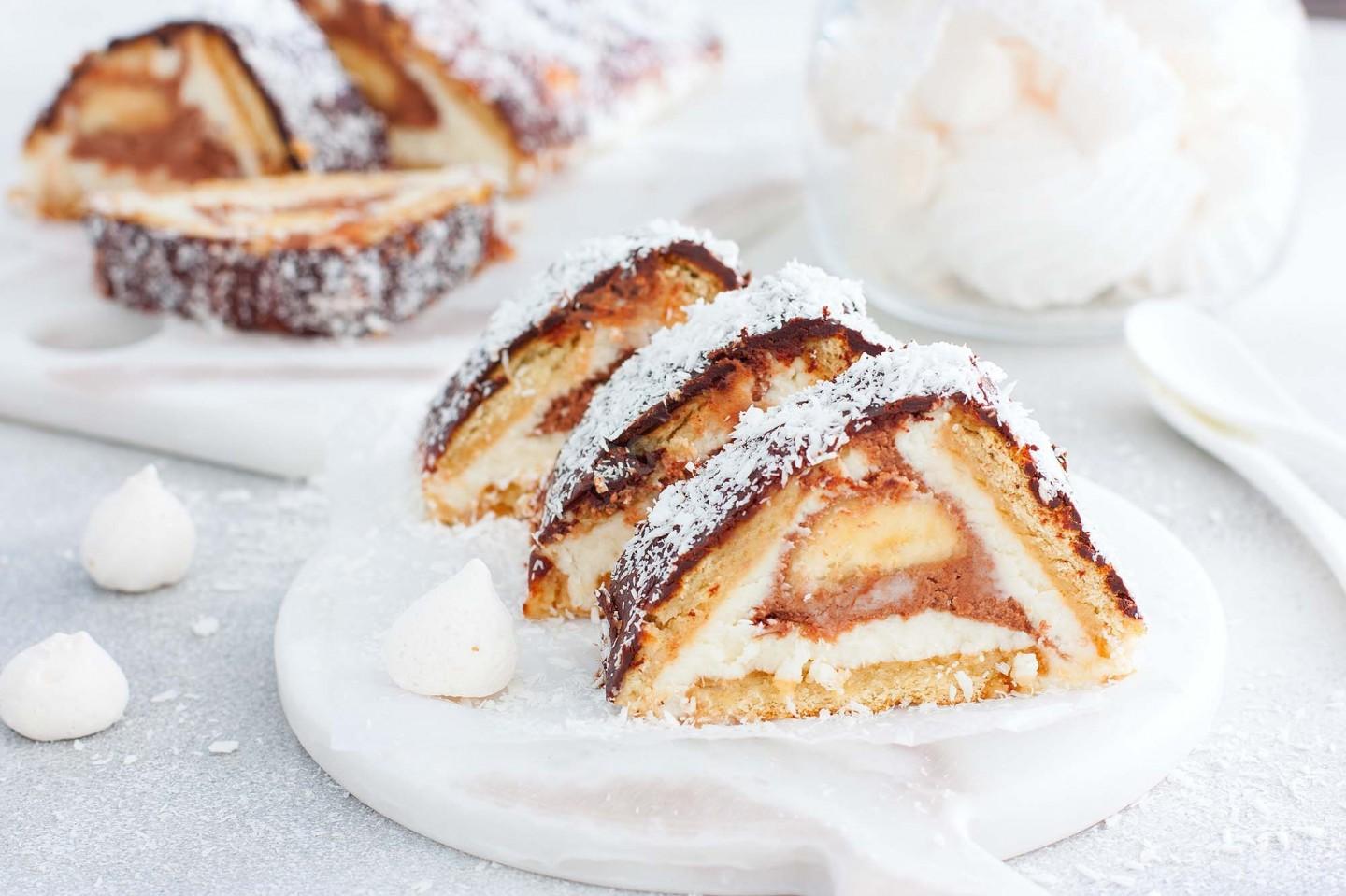 - Готовий десерт звільніть від харчової плівки, полийте розтопленим шоколадом та посипте кокосовою стружкою. Подавайте його до столу одразу з холодильника.