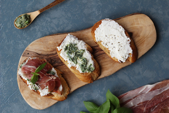 Хрустку брускету намажте крем-сиром, викладіть скибочку хамону, шматочок груші та посипте кедровим горіхом.