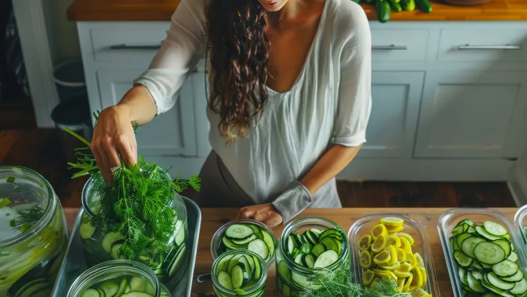 - Викладіть підготовлені огірки в маринад і залиште в каструлі, поки вони не змінять колір на оливковий, приблизно на 4 – 5 хвилин. За допомогою шумівки акуратно вийміть огірки з маринаду.
