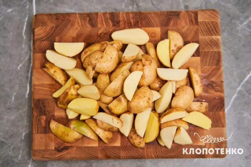 - Промиваємо 800 грамів молодої картоплі, нарізаємо її шматочками.