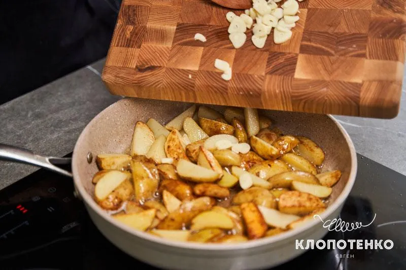 - Один зубчик часнику нарізаємо скибками, додаємо його на сковорідку разом із сіллю та перцем і смажимо ще 5 хвилин.