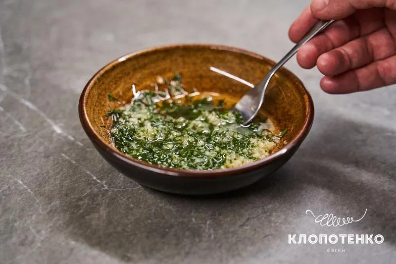 - Подрібніть часникодавкою чотири зубчики часнику. Дрібно нарізаємо п'ять гілочок кропу. Змішуємо 50 грамів соняшникової олії з часником і кропом.