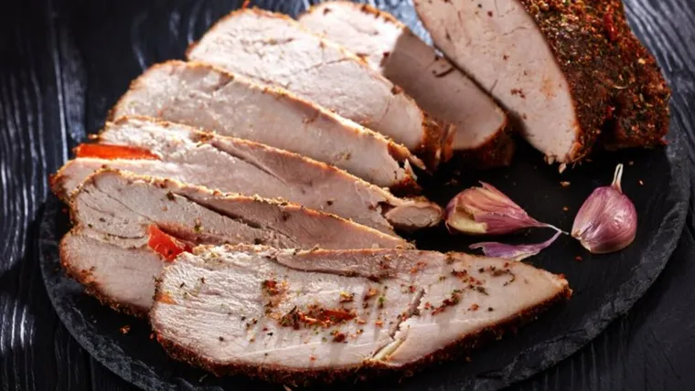 - Перекладіть готове м'ясо у сухий посуд і охолодіть. Лише після цього ріжте його порційними шматками.