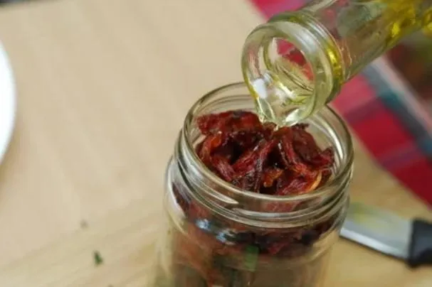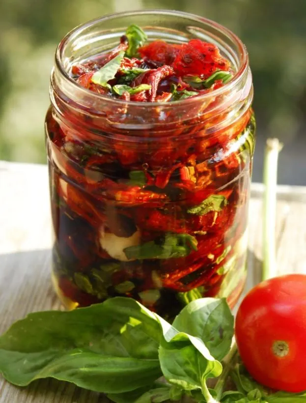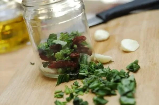 - Готові в'ялені помідори потрібно скласти в маленькі баночки, переклавши свіжими листочками базиліку, дрібно нарізаним часником.