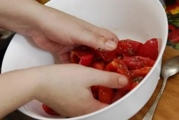 - У приготований маринад додайте помідори та ретельно вимішайте руками.