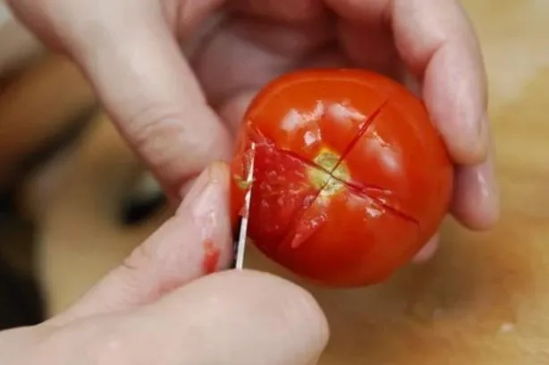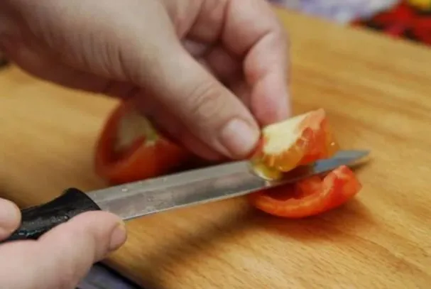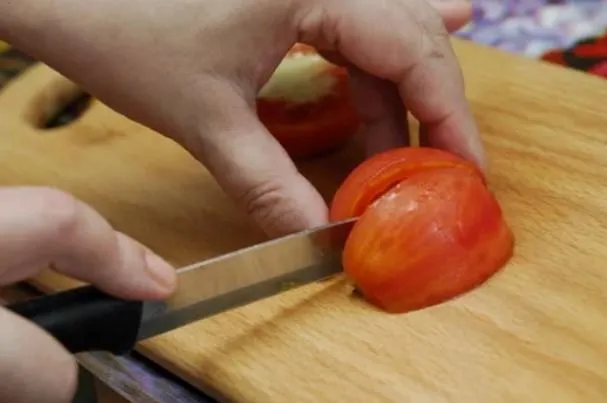 - Зніміть шкірку з помідорів за допомогою гострого ножа.