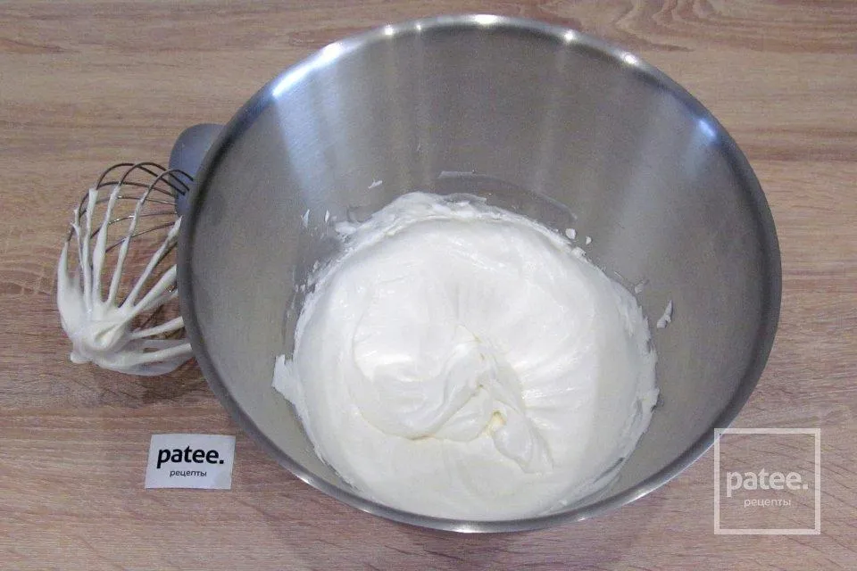 - Не припиняючи збивати вершки, додайте до них крем-сир.