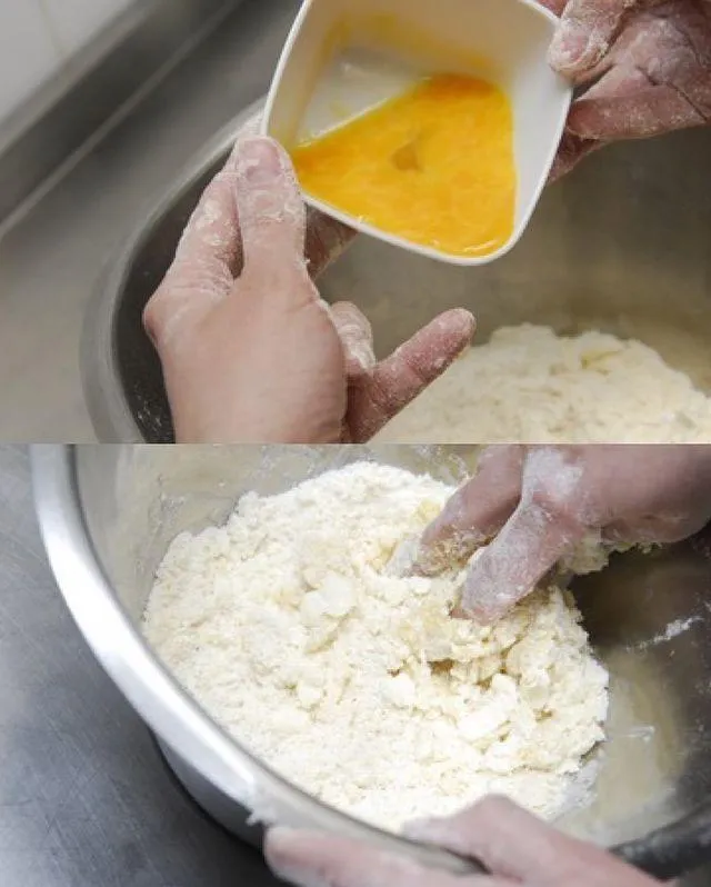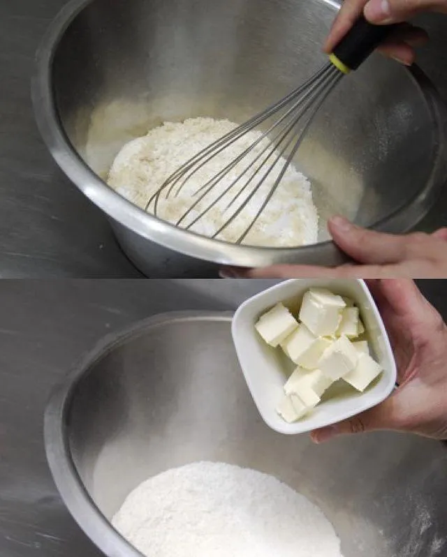 - З'єднайте мигдалеве борошно з пшеничним, додайте солі, цукру та холодні кубики вершкового масла.