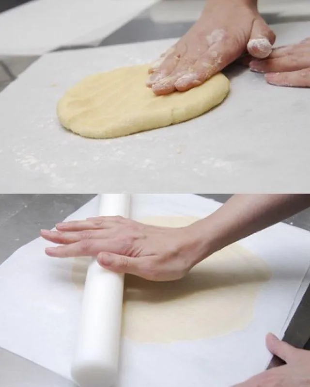 - Отримане тісто розкачайте між двома шарами пергаменту для випікання товщиною 3 – 4 міліметри. Відправте його в холодильник на кілька годин.