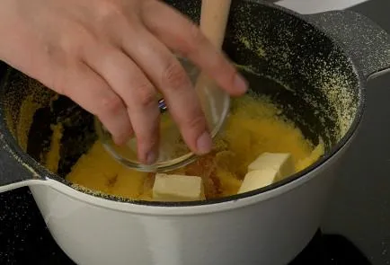 - Додайте в до окропу 1 столову ложку кукурудзяного борошна, перемішайте та доведіть до кипіння.
