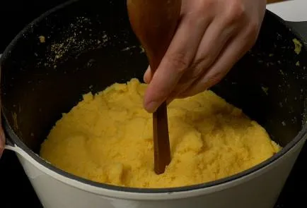 - Щоб перевірити кашу на готовність, встроміть в неї ложку та вийміть. Якщо вона залишилася без крупинок – накрийте кришкою та залишіть мамалигу ще на кілька хвилин.